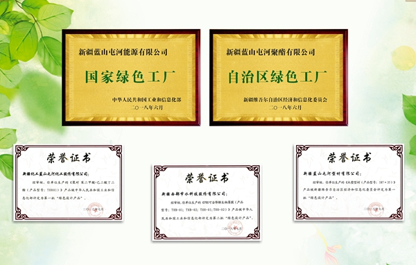 自2017年开展绿色制造体系建设以来,蓝山屯河公司下属聚酯、能源、型材、新材料公司先后被自治区经信委认定为自治区“绿色工厂”,2018年2月蓝山屯河能源公司被国家工信部确定为国家“绿色工厂”;蓝山屯河“聚对苯二甲酸-已二酸丁二酯(PBAT)”、蓝山屯河型材公司“木塑型材”、西部节水公司“PBS可全降解生物薄膜”、蓝山屯河聚酯公司“PBS生物降解树脂(聚丁二酸丁二醇酯)”产品被自治区经信委评定为自治区级“绿色设计产品”,2017年9月蓝山屯河“聚对苯二甲酸-已二酸丁二酯(PBAT)”产品被国家工信部评定为绿色设计产品,2018年2月西部节水公司“PBS可全降解生物薄膜”产品被国家工信部评定为绿色设计产品,国家绿色设计产品可按照GB/T 32162《生态设计产品标识》国家标准的要求粘贴绿色标识。