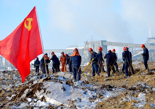 遥望远处,能源公司电石厂渣场空地的每个树埂上迎风飘动着“蓝山屯河”的彩旗,身穿着“蓝山屯河”工服的能源公司干部职工们秉承“不怕困难,勇于创新,敢于担当,每战必胜”的企业精神,踩着皑皑的白雪,顶着冽冽的寒风,三人一组,五人一群,通力协作,你铲土,我扶树,配合默契,劲往一处使、汗往一处流,干劲十足,一片热火朝天的热闹景象。