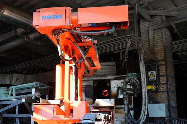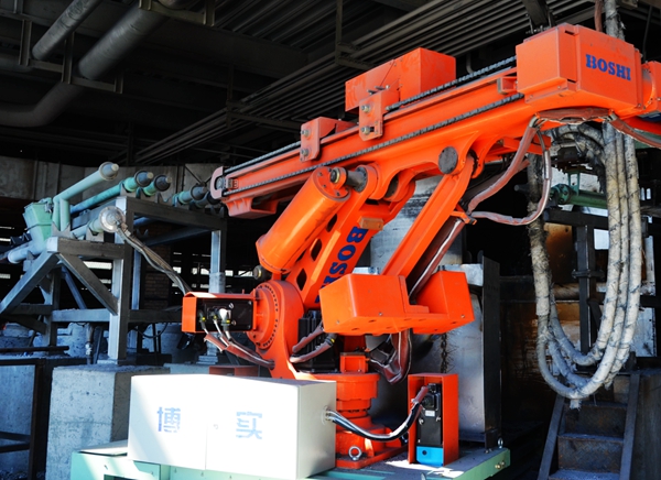 出炉机器人在人机交互式遥控操作系统指挥下,具备精确的自动定位和轨迹规划功能,实现操作工具的全自动、精确、稳定、可靠的抓取与更换。所配备的钢钎夹具有辅助系统,能够有效提高机器人的使用效率,对电石生产车间节能降耗,提高生产效率、标准化作业、安全生产意义重大。