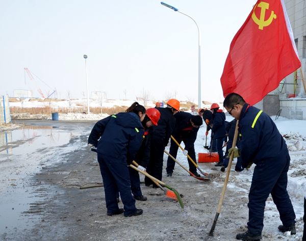 活动过程中,全体党员干劲十足,态度认真,热情高涨。储运部积极协调铲车,辅助破除积冰,综合管理部为大家提供茶水,送上温暖。大家配合默契,劲往一处使、汗往一处流,一片热闹景象,党员干部更是身先士卒、奋勇当先,经过一下午的努力,在大家团结互助,齐心协力下,完成了整个路面的全面清扫任务,换来了公司干净整洁的环境,仰望此刻的党旗在阳光的照射下显得格外红艳夺目,和党员们脸上洋溢出的笑容和谐相衬。