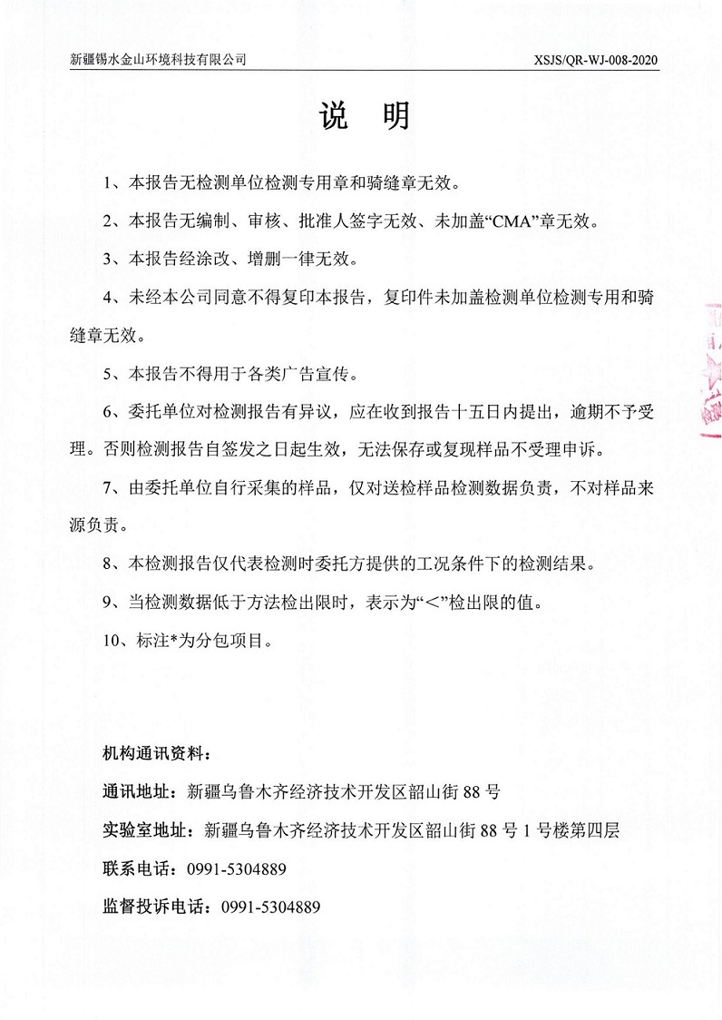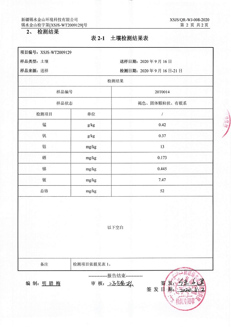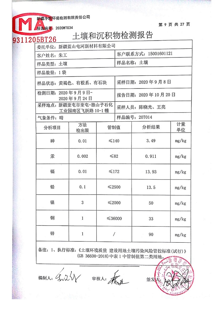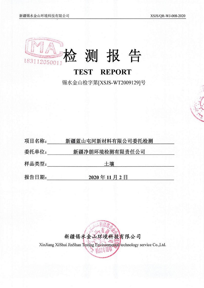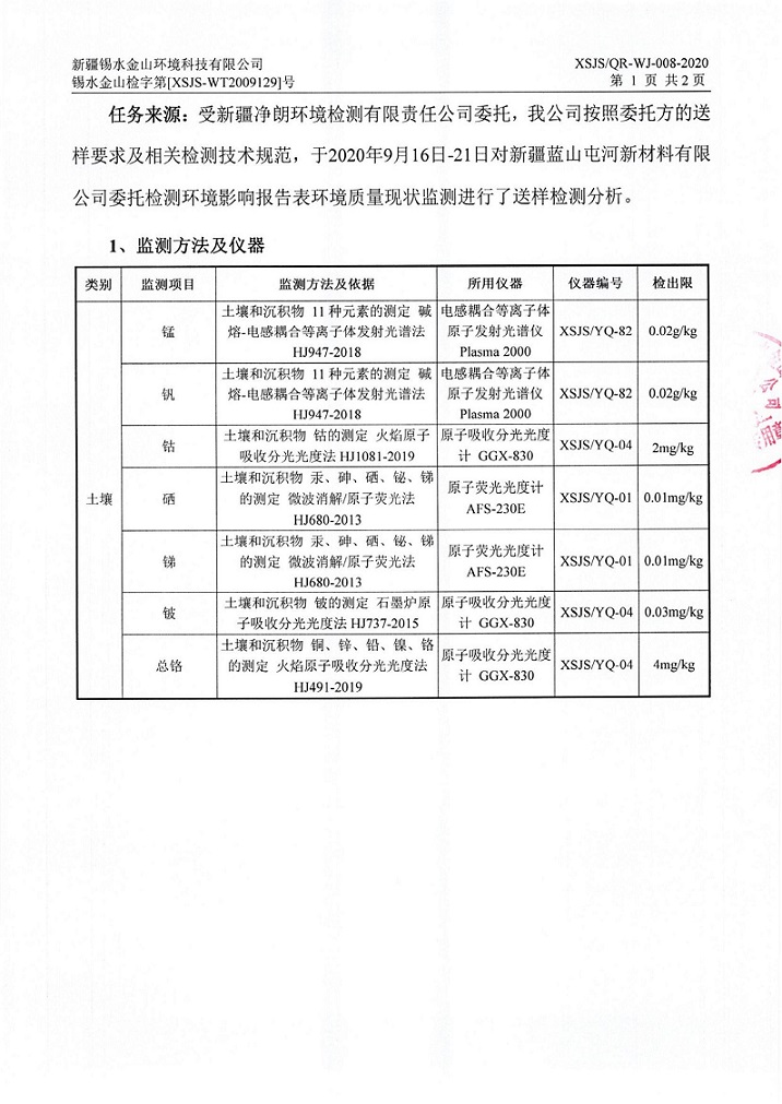 2020年9月8日,新疆净朗环境检测有限责任公司、新疆锡水金山环境科技有限公司在新材料公司内抽取土壤样本,进行检测,根据奎屯-独山子经济技术开发区环保局要求,现将新疆蓝山屯河新材料有限公司2020年重点污染单位土壤检测情况公示如下: